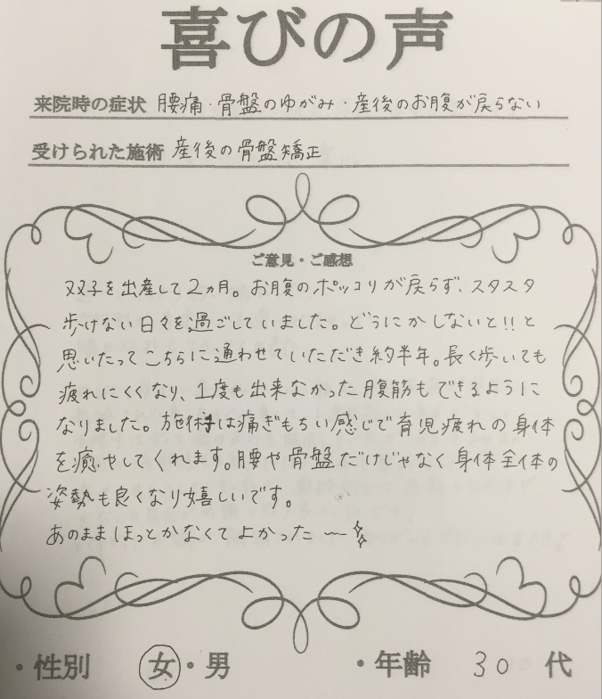 当院に来られた産後の骨盤でお悩みの方のお声を紹介します。ご参考になれば幸いです。